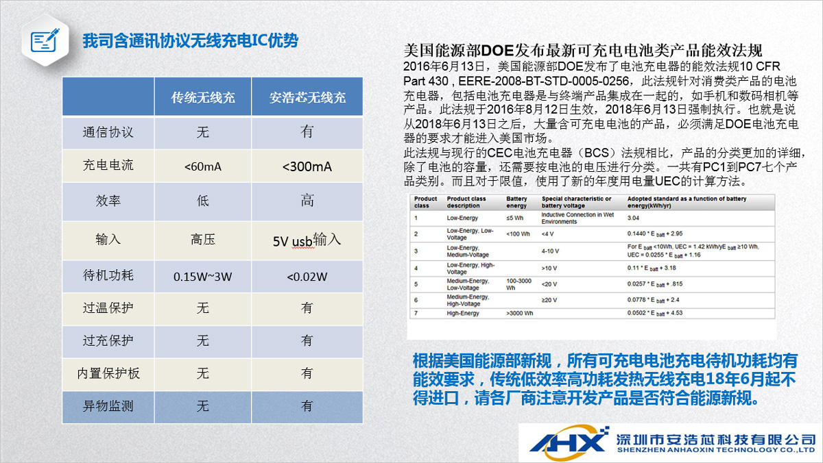 我司無線充電IC方案具有體高、成本優(yōu)勢明顯、應(yīng)用電路簡單等特點(diǎn),發(fā)射和接收IC集成度高,帶有通訊協(xié)議,具有異物識別、過充保護(hù)、過放保護(hù)、短路保護(hù)等功能。
